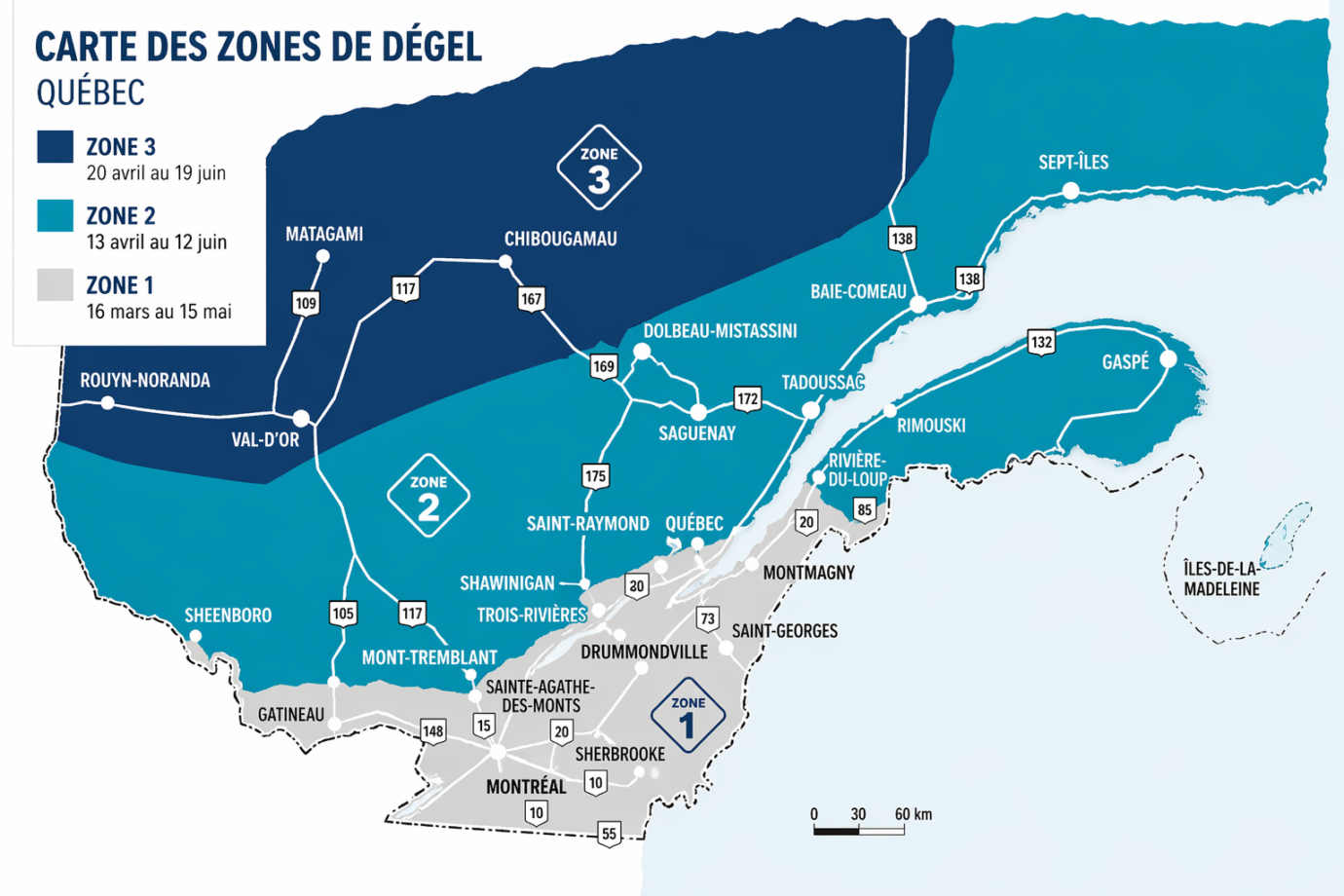 Le Québec est divisé en 3 zones de dégel, chacune ayant des dates différentes selon les conditions climatiques.
